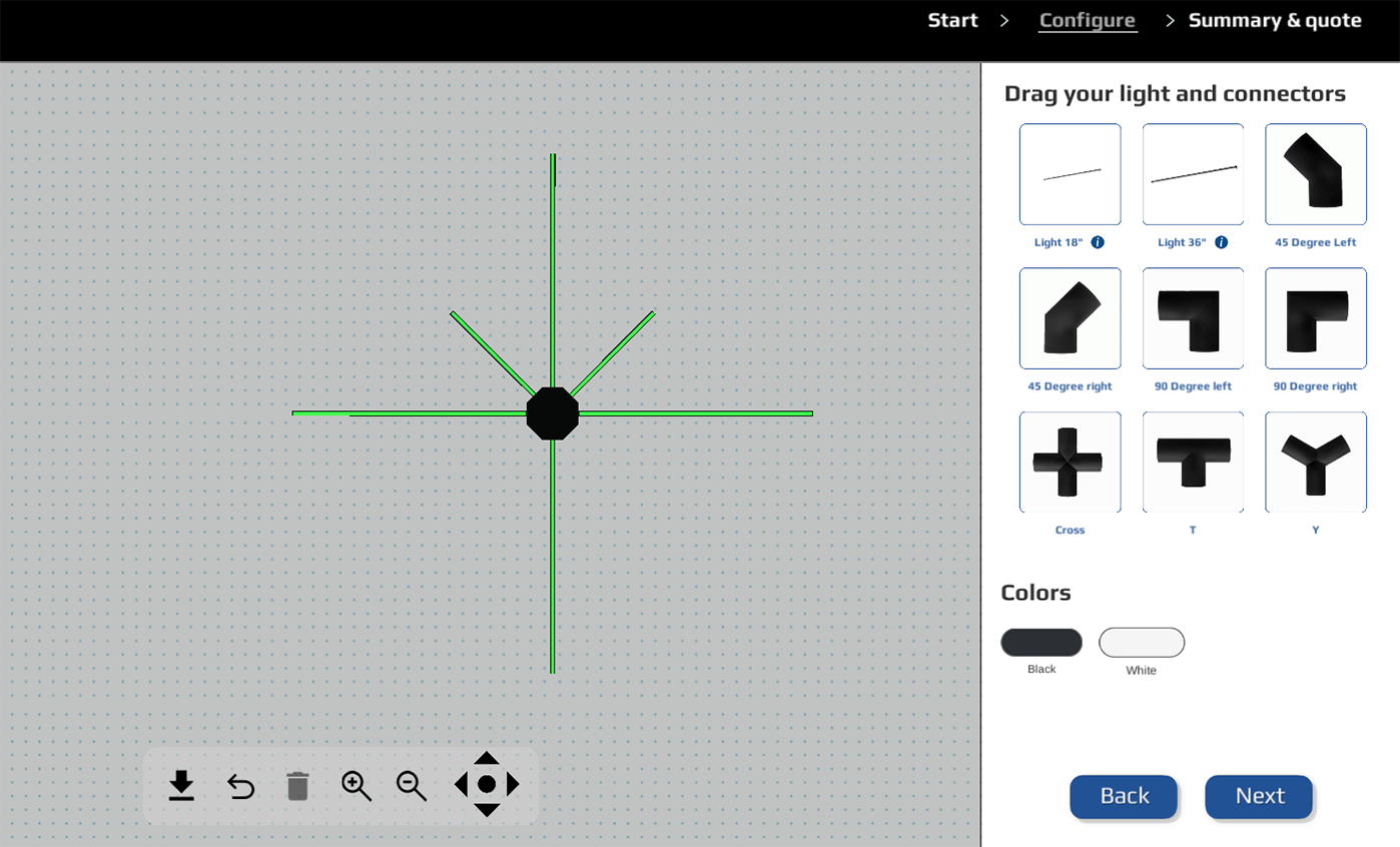 Créez la configuration d'éclairage qui vous convient et recevez une soumission gratuite, ou choisissez parmi les ensembles pré-configurés ci-dessous.